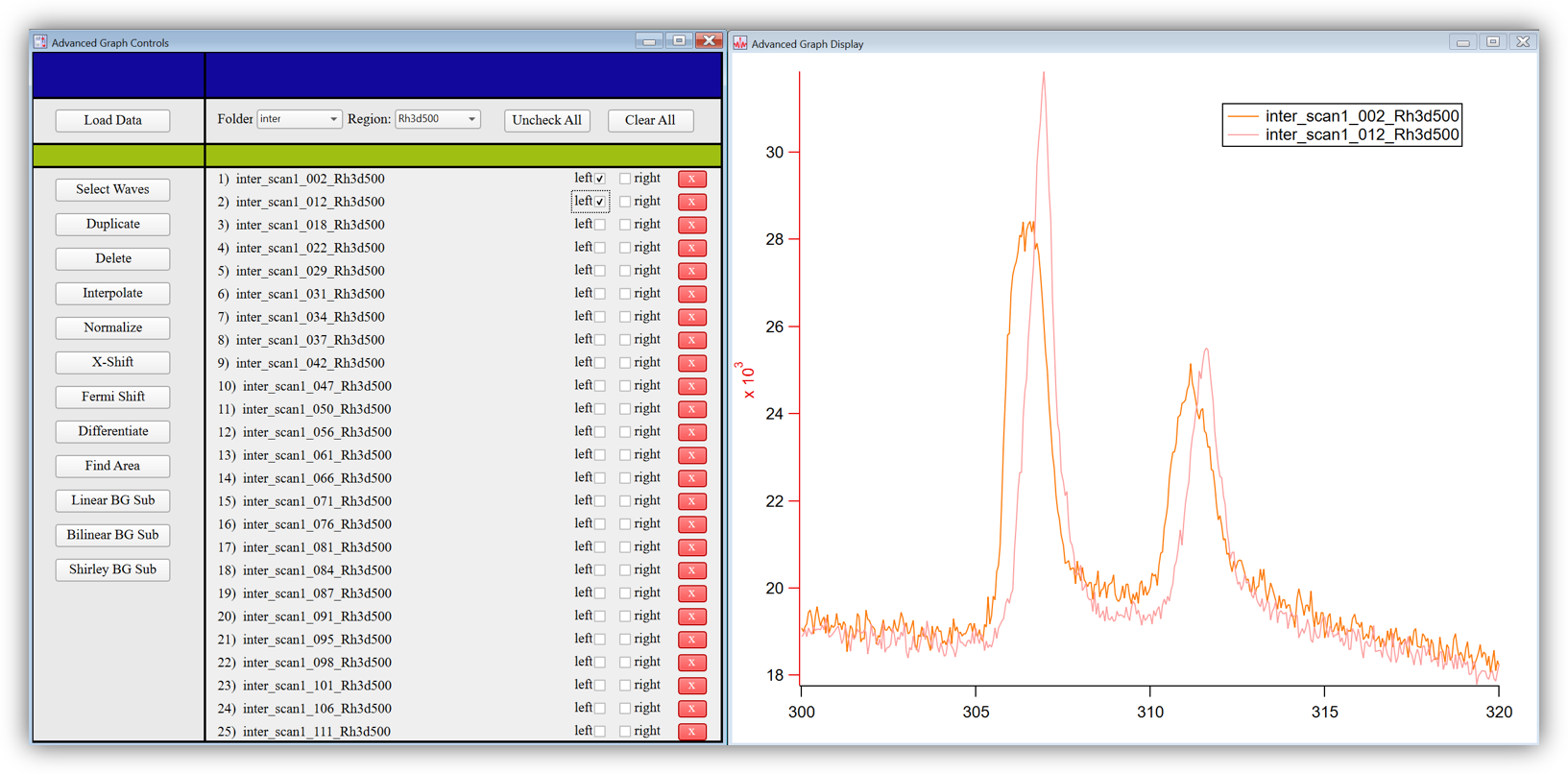- Screenshot of the processing interface, comparing two rhodium waves: