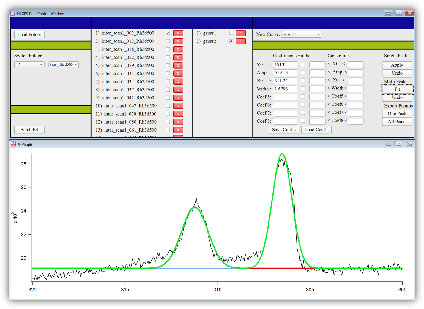 - Developed a Data Analysis GUI in the Igor Pro programming language for analyzing XPS data through statistical curve fitting. It provides tools for visualizing XPS wave data and fit curves, multi-curve fitting, and curve fitting on large batches of data.